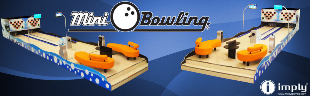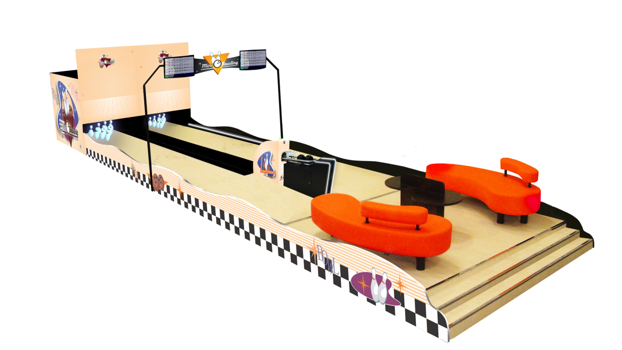De Mini Bowling heeft een volwaardige “string”pinsetter maar heeft kleinere ballen en kleiner pins. Leverbaar in verschillende lengtes, vanaf 9.94 meter t/m 13.67 meter. De Mini Bowling is uit te breiden met een spelers ruimte, voorzien van sofa`s en een tafel.